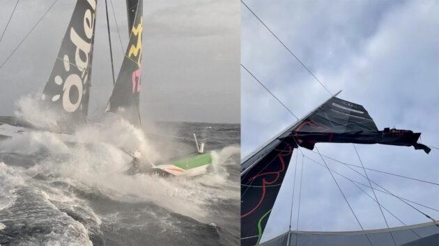 The Famous Project is currently around 800 miles from the finish, mostly sailing under bare wingmast and headsail alone. The mainsail of their giant trimaran initially tore at the second reef — a setback, but manageable given the strong wind conditions they faced in Biscay. However, the mainsail then ripped from luff to leech, leaving it unable to be hoisted, and the crew were reliant on the power generated by the giant wingmast, together with a headsail.