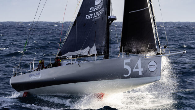 Boat-breaking conditions in the early stages of the 2025 Rolex Sydney Hobart – here Elizabeth Tucker’s Class 40 First Light takes off over a wave. Andrea Francolini/Rolex