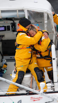 The Famous Project’s Alexia Barrier and Dee Caffari,embrace after finishing the Jules Verne Trophy on January 26, 2026. Photo: Lloyd / Jmliot Images / CIC