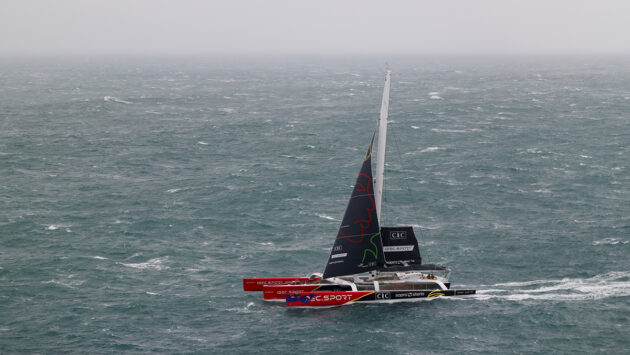 Under barely any mainsail, The Famous Project CIC aboard the IDEC Sport crosses the finish line off Ouessant after completing their Jules Verne Trophy non-stop crewed round-the-world record bid, in Brest on January 26, 2026. Photo: Lloyd / Jmliot Images / CIC