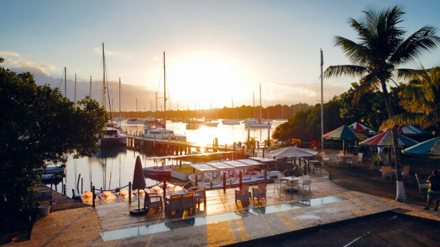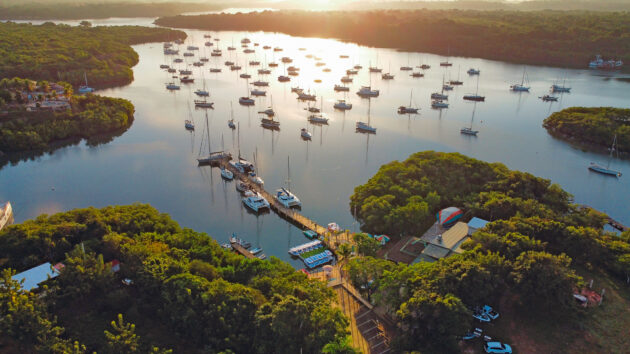 The mouth of the harbour is small, only 350m wide, and it opens up into two mile-deep mangrove-lined bays, like an upside-down ‘V’. The relentless waves kicked up by the tradewinds run into shallow water near the harbour mouth where manatees and sea turtles often bask. On nights when the sea is especially lively, you can hear the waves breaking from the still water in the anchorage in the western bay.
