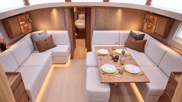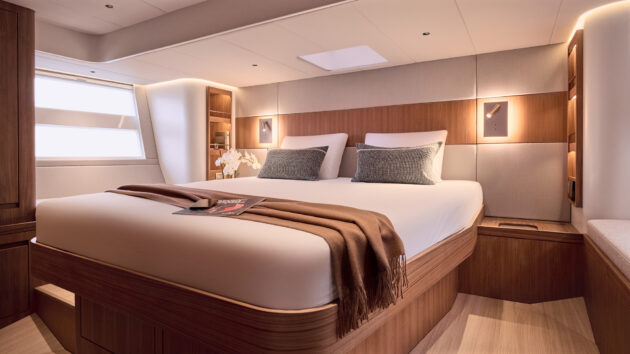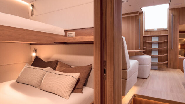 Introductions below deck range from tiny details like a specific location for corkscrew – yes, that level of detail – through ceiling-inset, rainfall shower heads, to the big things such as the range’s new style, radiused, vertically ribbed timber for the main bulkhead and forward walkway. And, adding to that super aft suite, midships bunked cabin and forward guest suite, there is now an optional fourth sleeping cabin. This then increases fixed berths from six to eight, while also providing additional, good practical sea berths close by the companionway for night or short-handed passaging. An impressive and thoroughly refreshing arrangement.