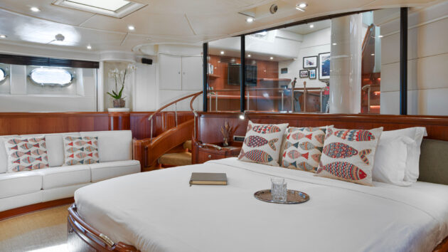 A palatial owner’s cabin runs the full beam of the boat aft, cleverly divided from its own private saloon by a glass bulkhead which can be covered by a blind for privacy. This underscores the family character of the boat, but also allows both spaces to make the most of the abundant natural light. Two further guest cabins, each including a Pullman berth, complete the accommodation for up to eight.
