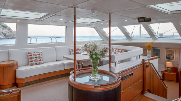 There is dining and lounging space in the large raised saloon, and more al fresco relaxing and entertaining in the cockpit, well shaded by the bimini. Further seating between the two helm stations gives a prime view of the sailing action, and there is another lounge area on the foredeck. Space for six crew ensures high levels of service and comfort are possible.