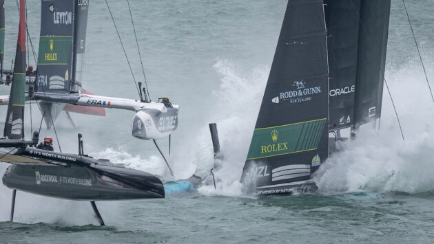 The cause of the Kiwi F50’s spin out has been discussed in detail. Essentially, SailGP’s findings point to an excess of ride height allowing the boat to skid sideways, developing more lift than could be scrubbed off with a change in angle of attack of the foil before they found their grip and, along with a nose dive, spun into the path of the French.
