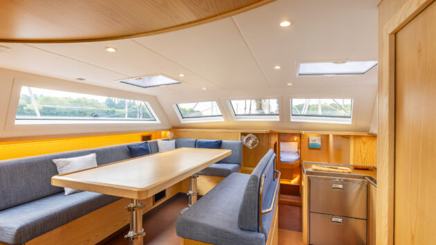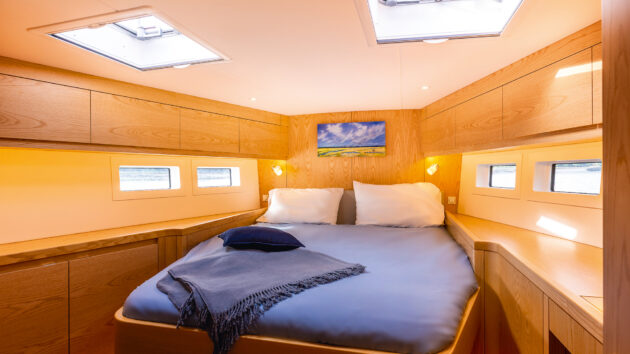 The majority of its owners are couples, who are on passage for comparatively short amounts of time they spend aboard, so Boreal believes it makes sense to them to have the owner’s cabin forward, where it is away from the dock and noises and can benefit from the space the scow shape helps provide. They can then pick from the saloon or aft berths when on passage.