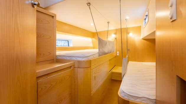Starboard aft cabin with double and twin berths (with lee cloths) can also be configured with bunks or as a technical workshop. Photo: Jean-Marie Liot/Boreal