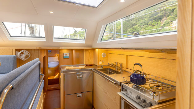 The 56 has multiple hearts, including the longitudinal galley leading to the stove. Photo: Jean-Marie Liot/Boreal