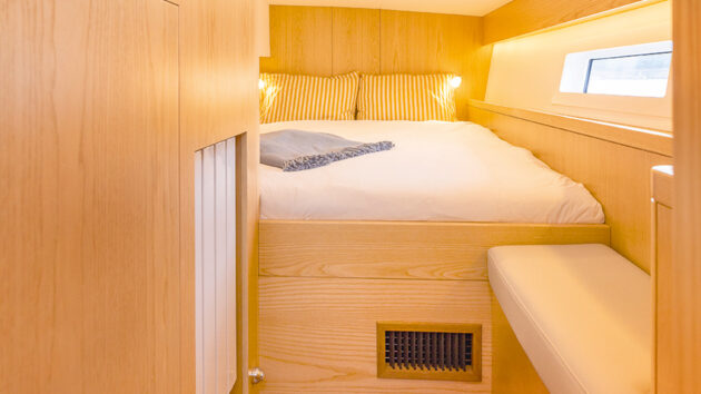 The forward master cabin utilises the full bow shape, providing a large peninsula berth. It’s a generous and naturally light cabin, with plenty of stowage, including beneath the berth, but no tall hanging locker.