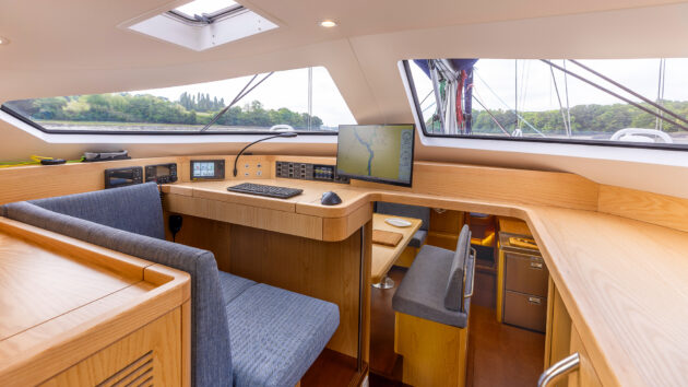 Otherwise, the cockpit is superb, huge and deep, with high backrests, coamings with really useful, deep outboard stowage, and a large fixed table with long grab rails. This area is all completely free of lines, including the mainsheet, which sheets to the doghouse roof and back to the aft winches.