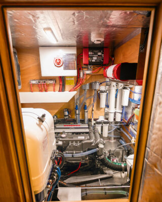 The aft cabins meanwhile feature double and twin berths, both with leecloths and the latter with good separation between berths. This starboard twin can also be configured with bunks or as a workshop/technical cabin. The main access to the superb engine room is through a door in the port cabin, where everything is very accessible, including the watermaker raised up aft, with membranes and filters on the bulkhead.