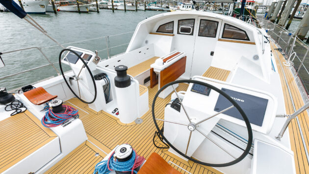 The helm area again shows where experience has paid. The twin wheels are far enough outboard for visibility to the bow, with sheet winches to hand on each side to ease solo operation. The powered utility winch with remote foot controls proved very useful, as all lines can be led to this central position between the wheels (although that can temporarily block cockpit access). Meanwhile deep, built-in tail bins keep the whole area tidy.
