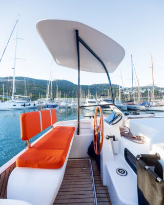 Comfortable helm seat raises for swim platform and engine access. Photo: Andreas Lindlahr/EYOTY