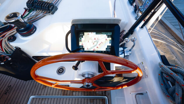 The layout of the winches and control systems is also well considered for easy handling when short-handed, including this traveller. Its controls lead to a winch (optionally powered) within reach of the starboard helm, from where the rest of the sail controls are also managed. There’s even a locker here for the battery switches and winch breakers.