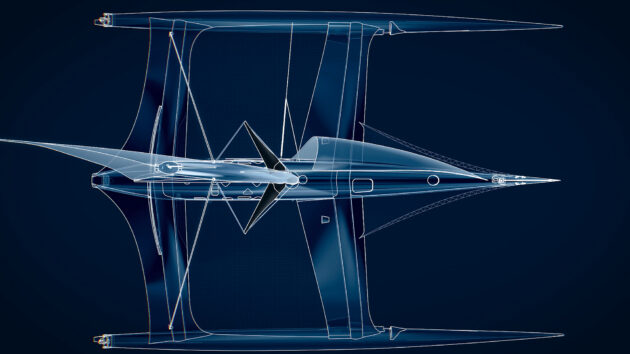 The physics driving these foil shapes will require whoever is piloting to trim complex underwater interactions over multiple planes, often while sailing solo. This a very different prospect to a full-time flight controller minutely trimming the foils of an AC75 over a windward-leeward Cup course. The Y-foils alone can be canted, raked, and each wing has independently adjustable flaps on the trailing edges.